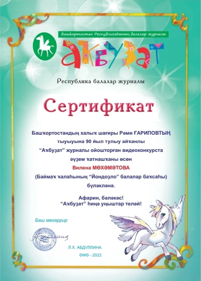 "Аҡбуҙат" журналы үткәргән Рәми Ғарипов исемендәге конкурста ҡатнашҡаны өсөн Мөхәмәтова Вилена сертификат һәм китап менән бүләкләнде.