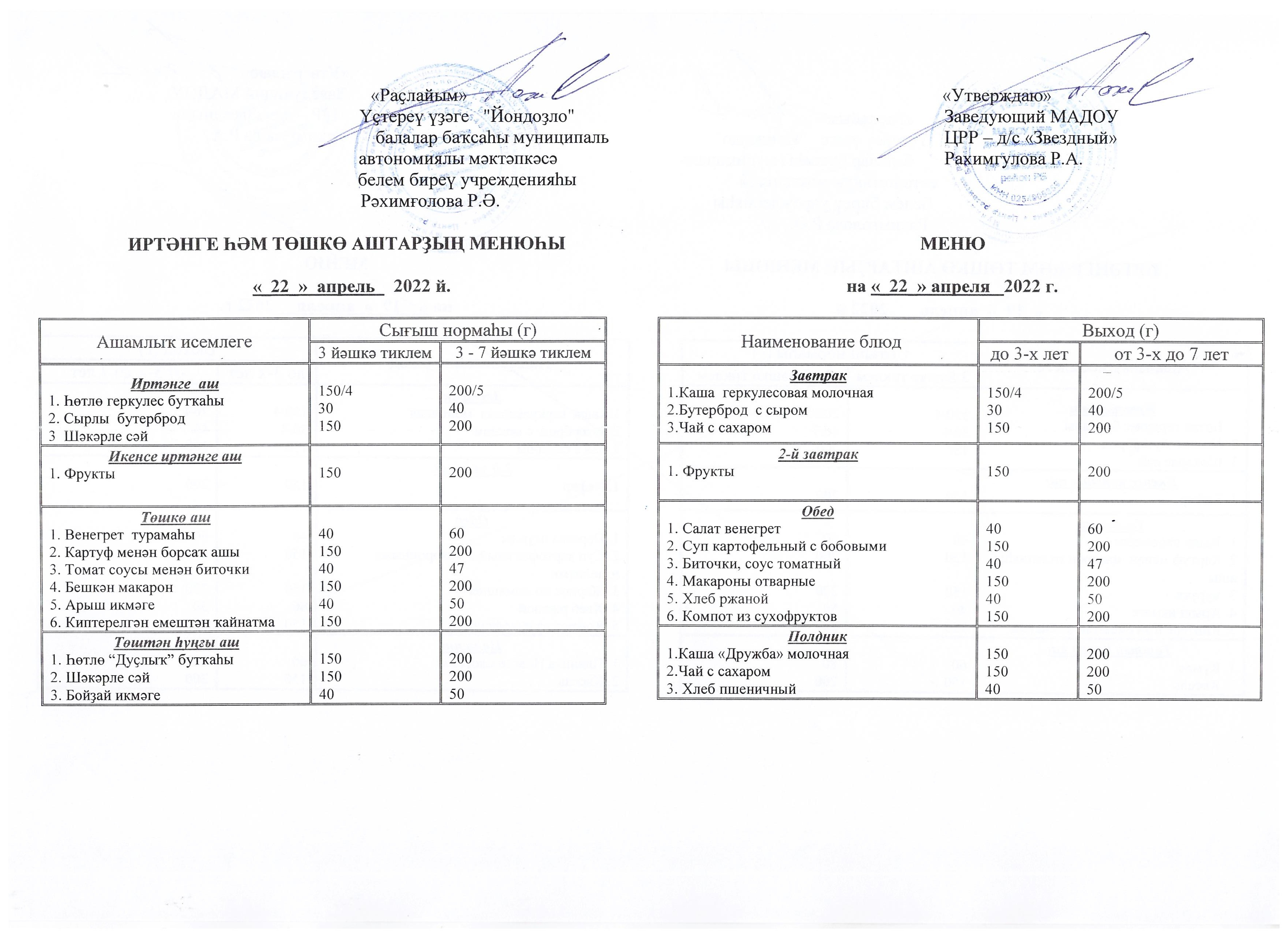 (Меню на 22.04.22 г.)
