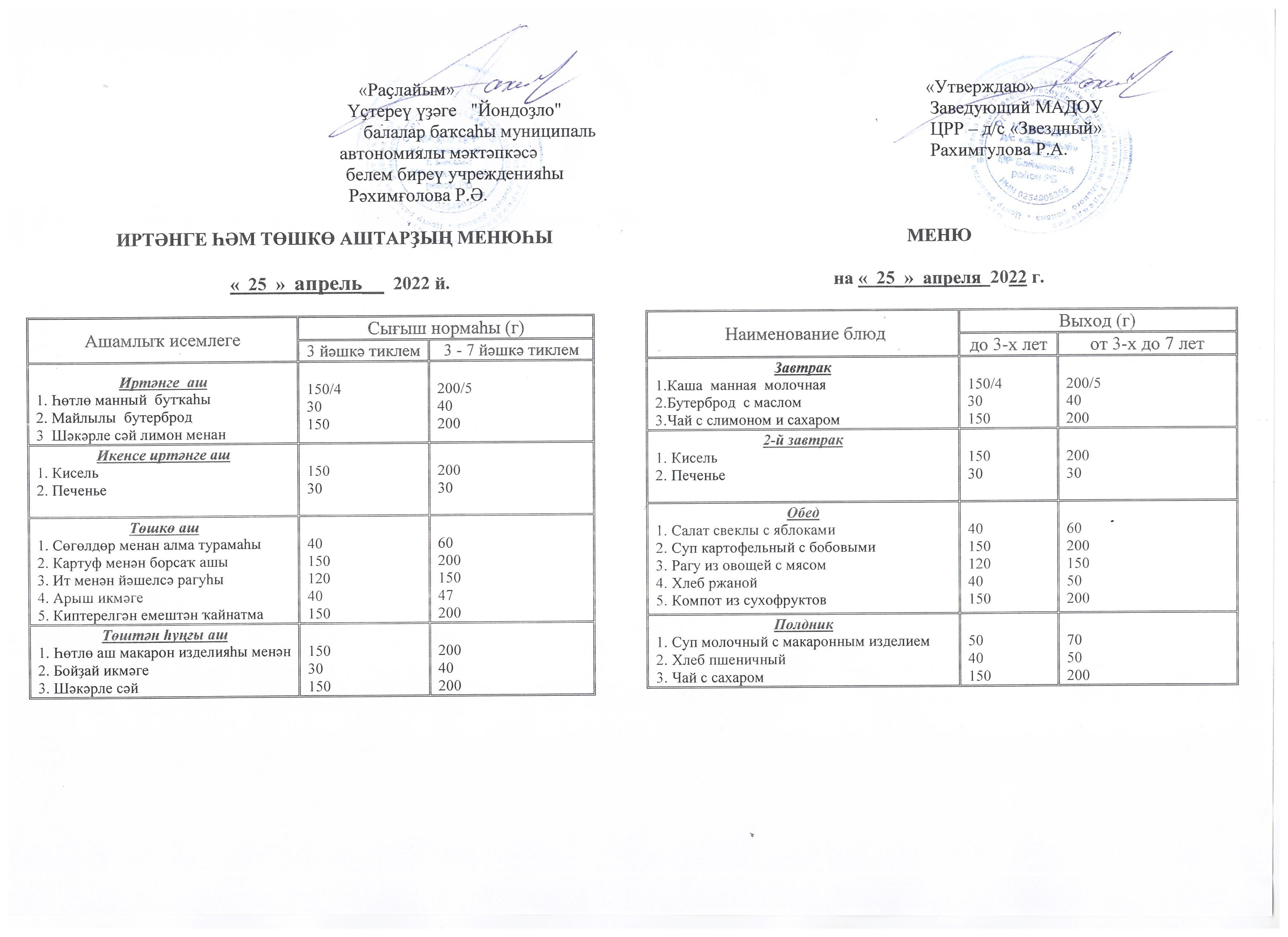 (Меню на 25.04.22 г.)
