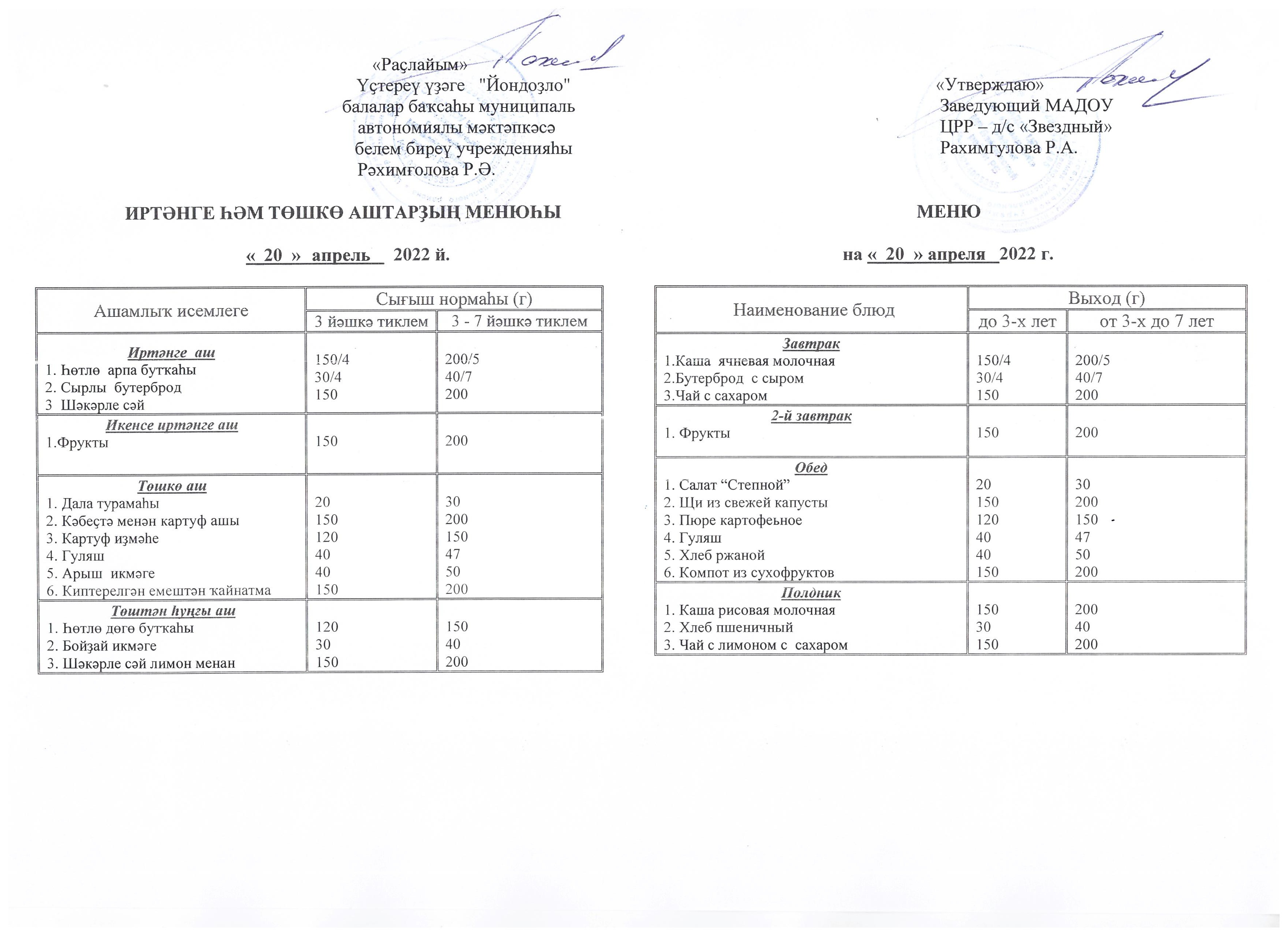 (Меню на 20.04.22 г.)