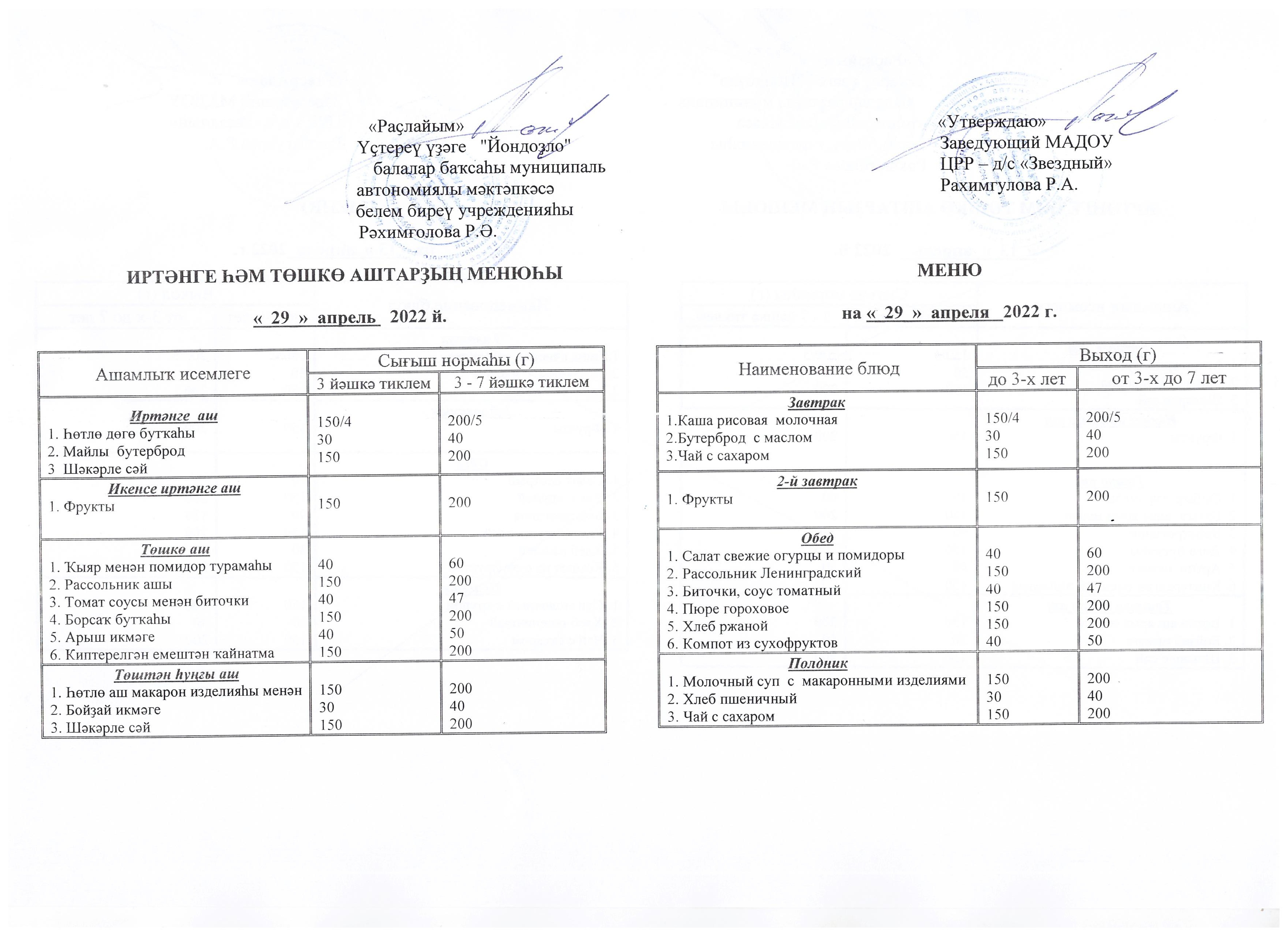 (Меню на 29.04.22 г.)