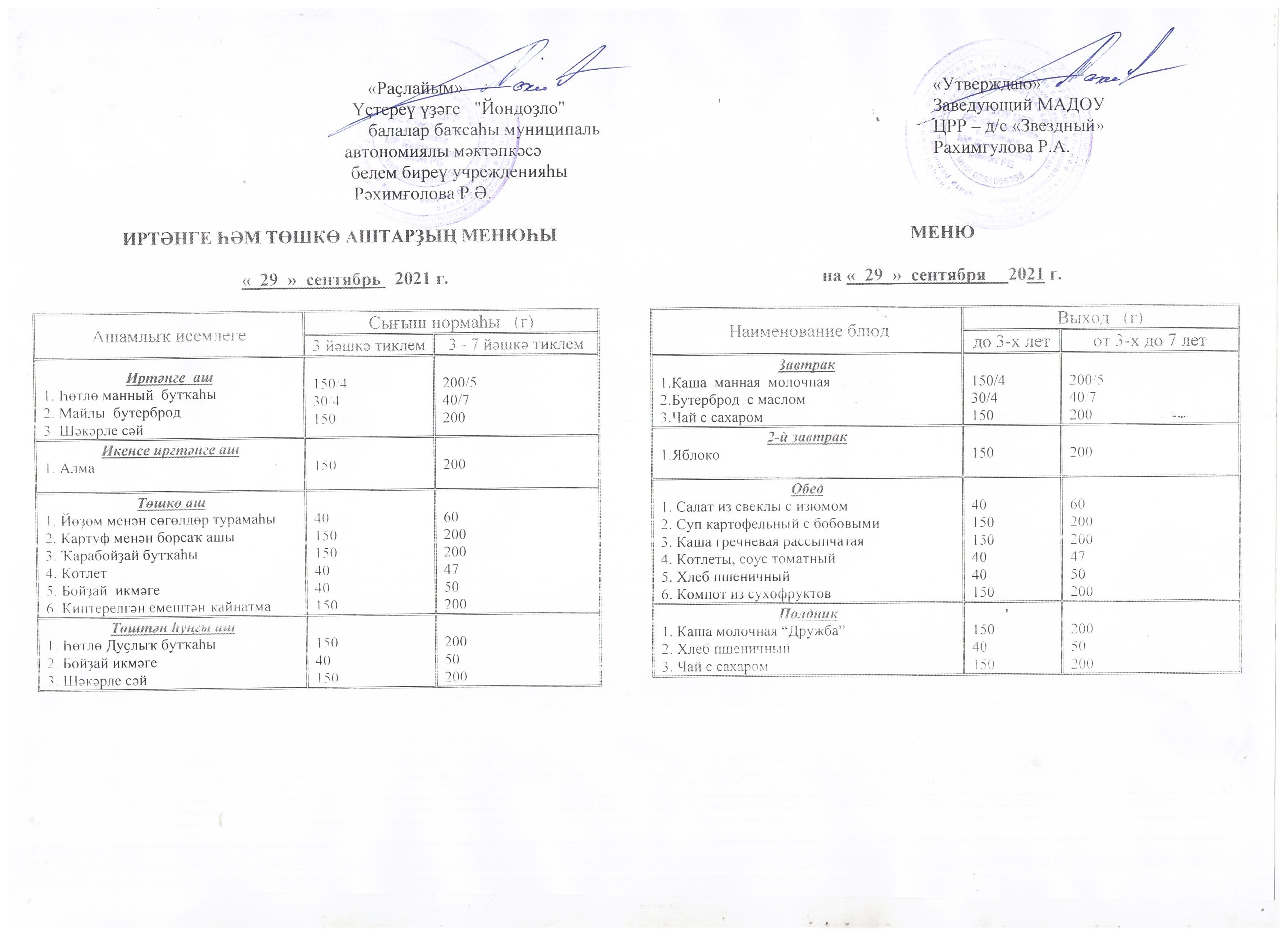 (Меню на 29.09.21 г.)